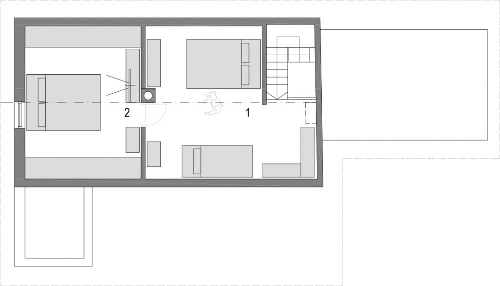 - Spalnica – soba 1 (zakonska postelja za dve osebi 140 x 200 in enojno ležišče za eno osebo 90 x 200)